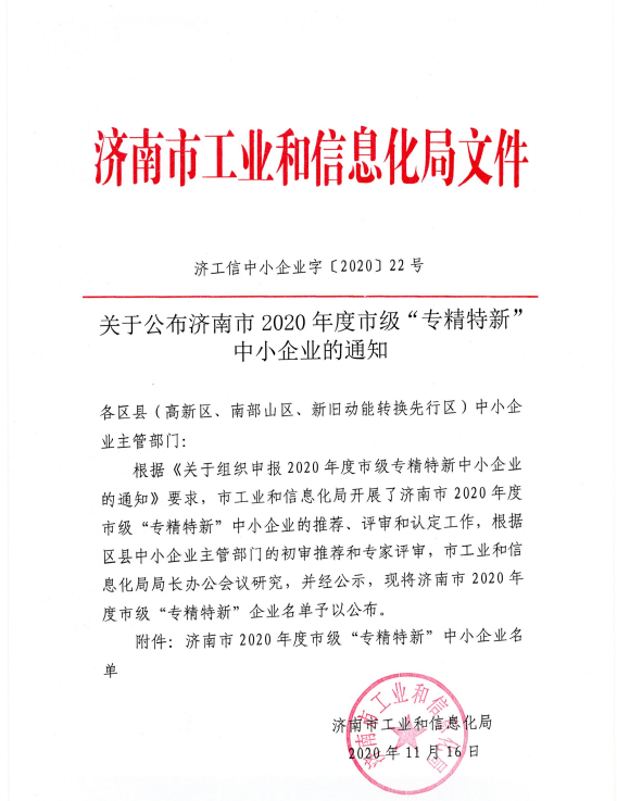 11月23日,濟(jì)南市工業(yè)和信息化局官網(wǎng)發(fā)布2020年度濟(jì)南市“專精特新”企業(yè)名單,山東CA成功入選。
