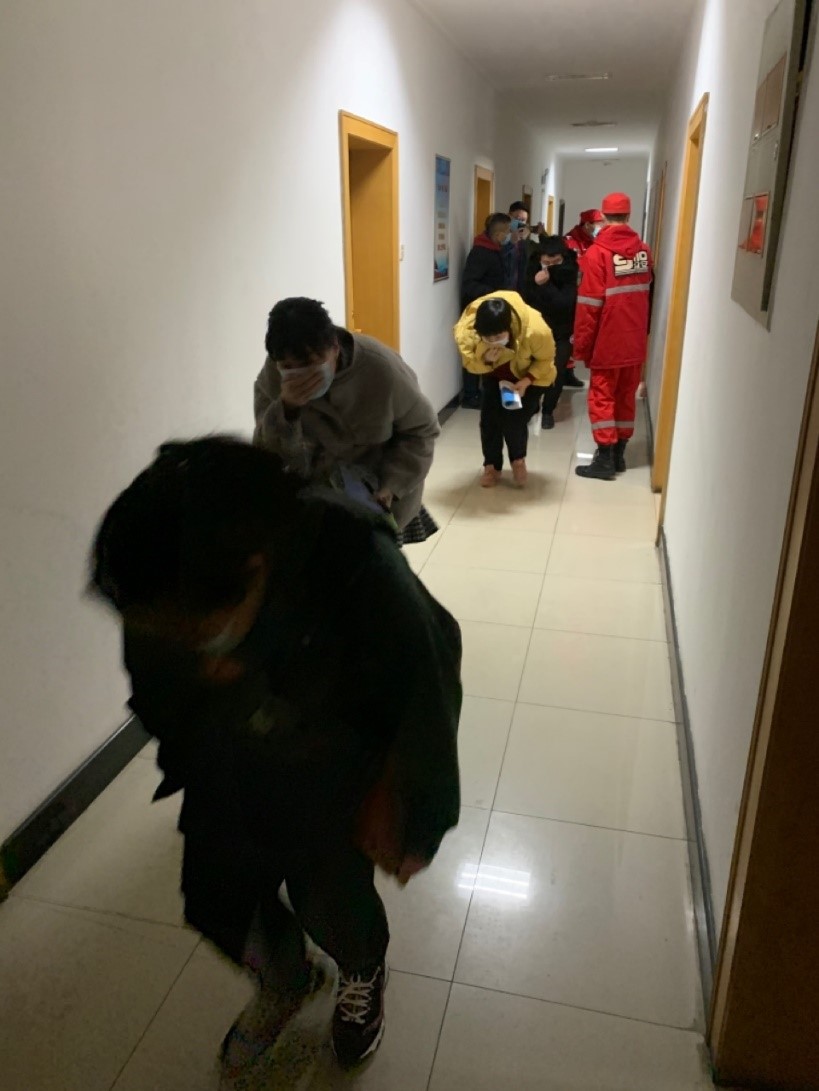 在逃生自救環(huán)節(jié),隨著警報(bào)鈴聲響起,3號(hào)樓各單位參訓(xùn)人員,在專業(yè)人員指導(dǎo)下,用濕毛巾捂住口鼻,俯身、貼墻、有序迅速撤離。