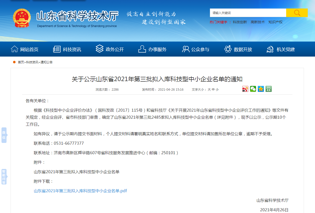 4月26日,根據(jù)《科技型中小企業(yè)評(píng)價(jià)辦法》(國(guó)科發(fā)政〔2017〕115號(hào))和省科技廳《關(guān)于開(kāi)展2021年山東省科技型中小企業(yè)評(píng)價(jià)工作的通知》等文件有關(guān)規(guī)定,經(jīng)企業(yè)自評(píng)、省市科技部門審查,山東省2021年第三批擬入庫(kù)科技型中小企業(yè)名單公示。山東CA成功獲得認(rèn)定。
