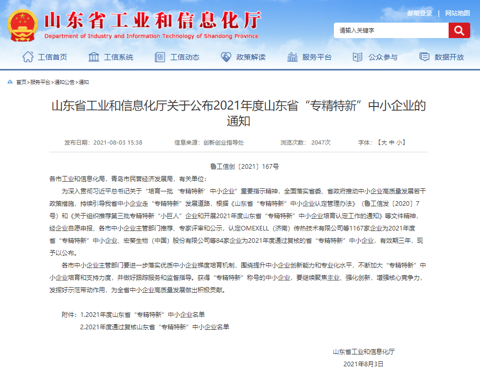 8月3日,山東省工業(yè)和信息化廳官網(wǎng)發(fā)布2021年度山東省“專精特新”企業(yè)名單,山東CA成功入選。