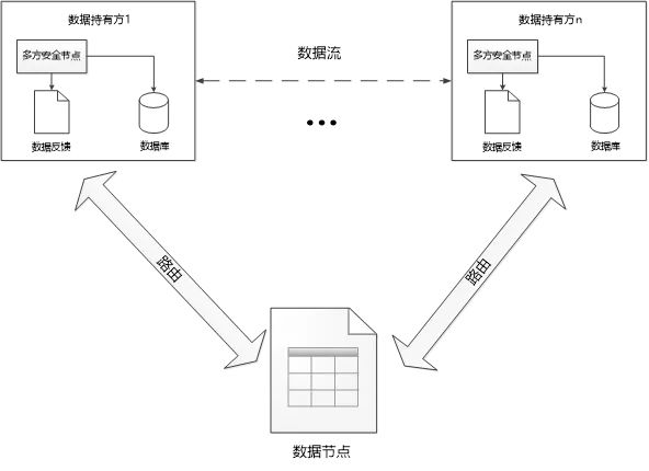 通常安全多方計算系統(tǒng)中,每個數(shù)據(jù)持有者由數(shù)據(jù)反饋、數(shù)據(jù)庫和安全多方計算節(jié)點構(gòu)成。所有的數(shù)據(jù)持有者權(quán)限相同,可以同時執(zhí)行計算任務(wù)。各個數(shù)據(jù)持有者之間的數(shù)據(jù)流通稱為數(shù)據(jù)流,而每個數(shù)據(jù)持有者在本地完成數(shù)據(jù)的處理并將處理后的結(jié)果發(fā)送給數(shù)據(jù)節(jié)點。這種系統(tǒng)可以保證在大數(shù)據(jù)環(huán)境下用戶的隱私,如圖3所示。