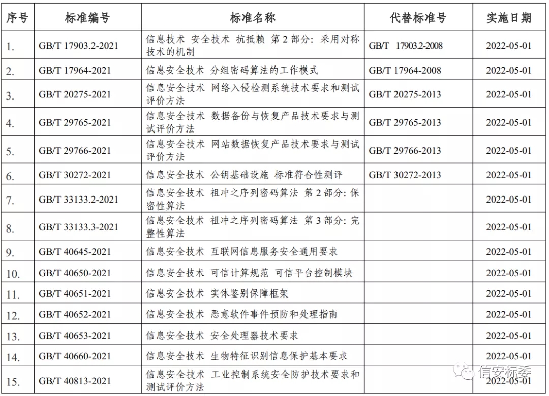 根據(jù)2021年10月11日國家市場監(jiān)督管理總局、國家標(biāo)準(zhǔn)化管理委員會發(fā)布的中華人民共和國國家標(biāo)準(zhǔn)公告(2021年第12號),全國信息安全標(biāo)準(zhǔn)化技術(shù)委員會歸口的15項(xiàng)國家標(biāo)準(zhǔn)正式發(fā)布。具體清單如下: