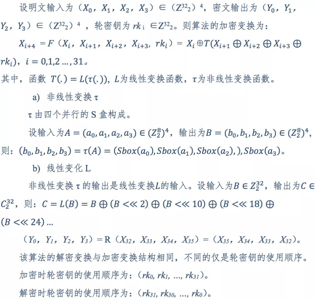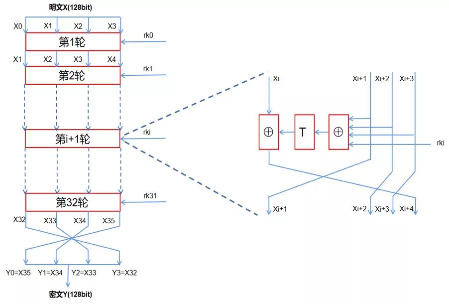 SM4密碼算法:算法采用32輪非線性迭代結構。解密算法與加密算法的結構相同,只是輪密鑰的使用順序相反,解密輪密鑰是加密輪密鑰的逆序。