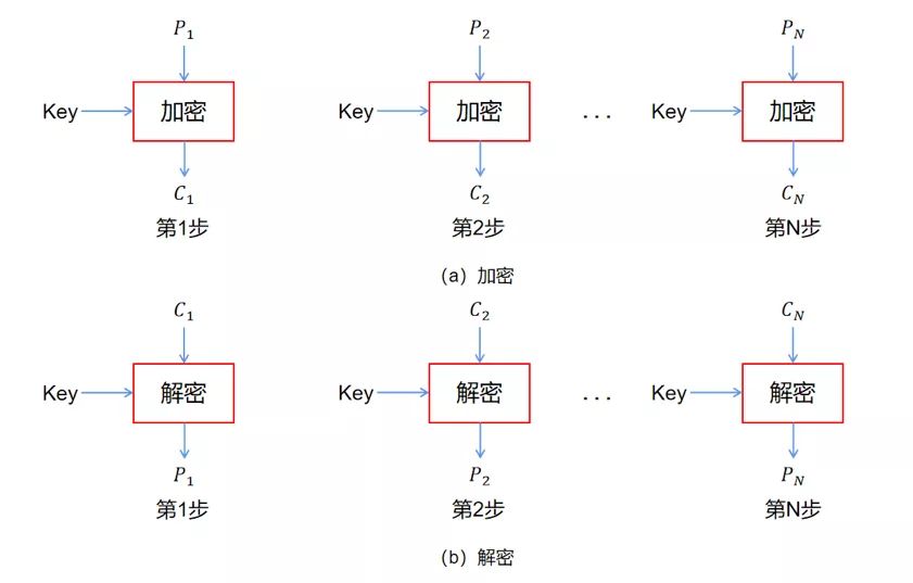 電碼本模式:電碼本模式直接利用加密算法分別對分組數(shù)據組加密。在給定的密鑰下同一明文組總產生同樣的密文組。這種方式會暴露明文數(shù)據的格式和統(tǒng)計特征,由于重要的數(shù)據常常在同一位置上出現(xiàn),使密碼分析者可以對其進行統(tǒng)計分析、重傳和代換攻擊(圖3)。