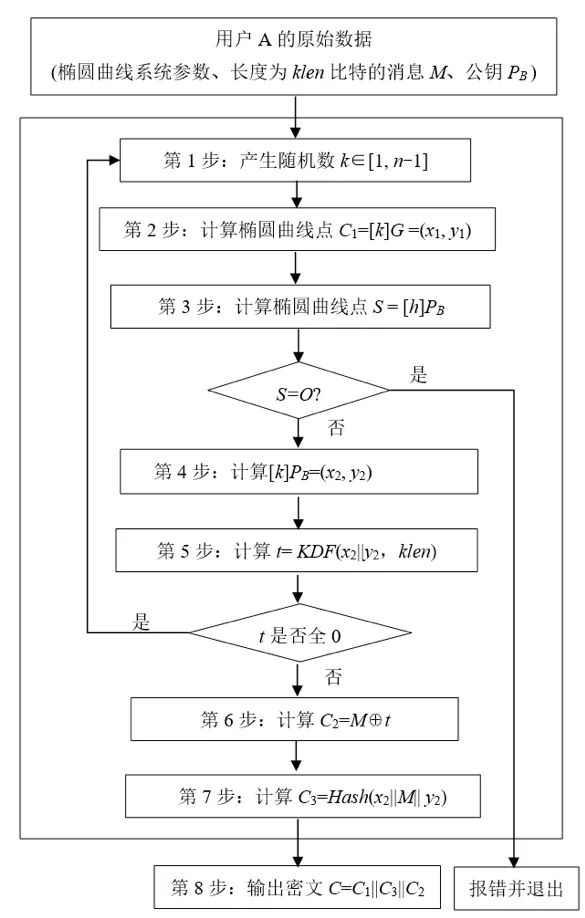 SM2加密算法:根據《GB/T 32918.4-2016信息安全技術 SM2橢圓曲線公鑰密碼算法 第4部分:公鑰加密算法》的要求,SM2加密算法流程如下。