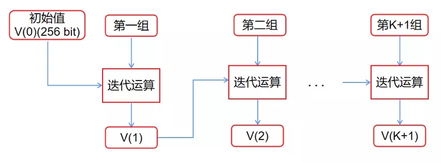 SM3算法的Hash運算主要是在壓縮函數(shù)部分,壓縮函數(shù)共包含64輪,每輪包括12步運算,64輪循環(huán)計算結束后,再將計算結果與輸入到本輪計算的初始數(shù)據進行異或運算,即上一次Hash運算的Hash值輸出與輸入到本輪計算的初始數(shù)據異或得到本次Hash值輸出。