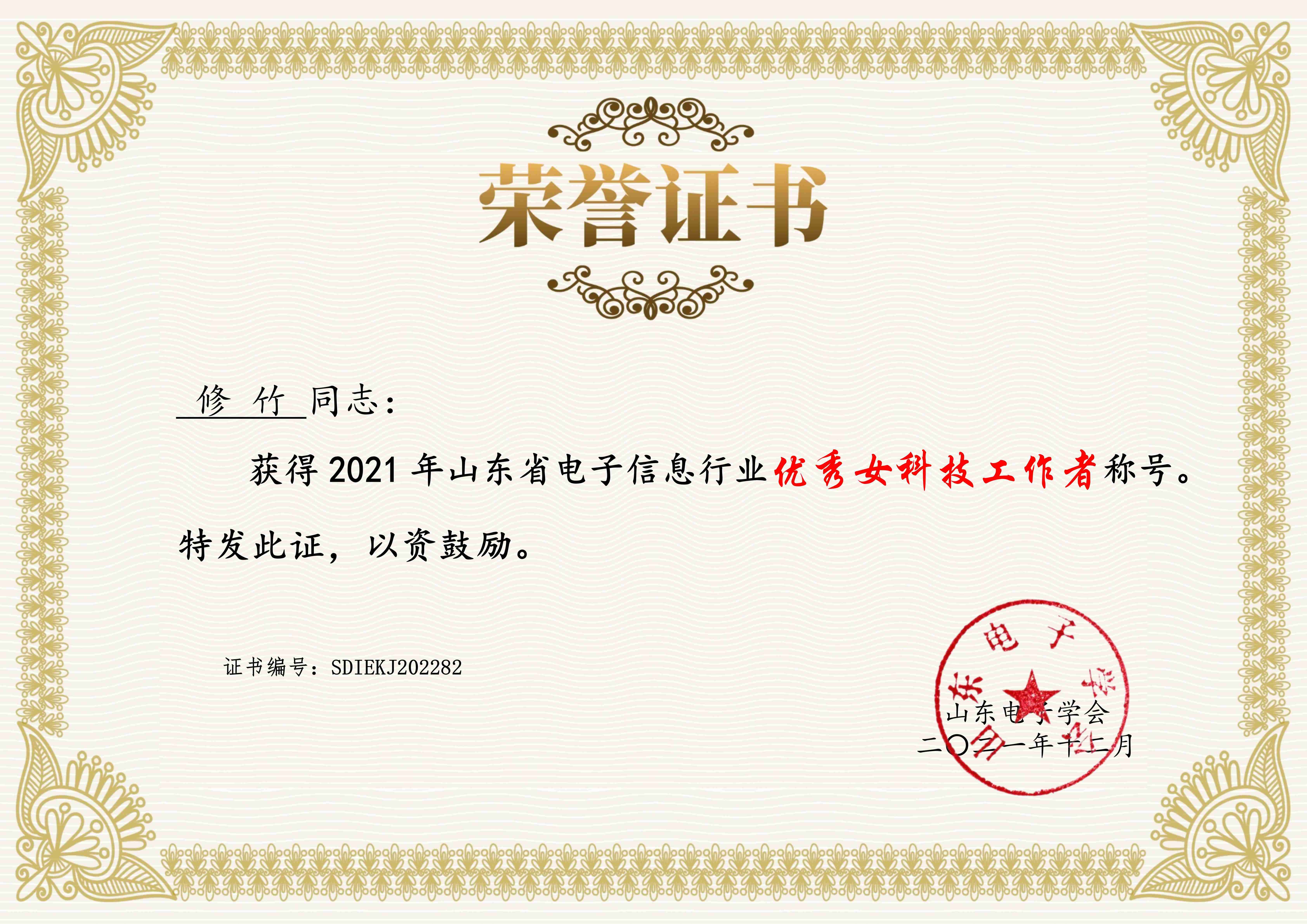熱烈祝賀我公司修竹同志榮獲2021年山東省電子信息行業(yè)優(yōu)秀女科技工作者榮譽稱號