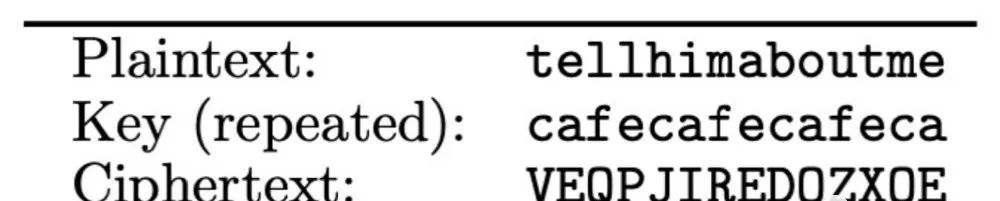 可以使用統(tǒng)計攻擊來破解“單字母替代加密”,因為它的密鑰定義了一個固定的映射,該映射逐字應(yīng)用于明文。在“多字母替代加密”中,該攻擊無效,它的密鑰定義了應(yīng)用于明文字符塊的映射。多字母替代加密“平滑”了密文中字符的頻率分布,使其更難進(jìn)行統(tǒng)計分析。維吉尼亞加密就是多字母替代加密的一種,可以看作是將移位密碼的不同實例應(yīng)用于明文的不同部分。如下圖所示,它的密鑰是一個字符串。加密是通過按密鑰的下一個字符表示的數(shù)量移動每個明文字符來完成的,必要時在密鑰中環(huán)繞。