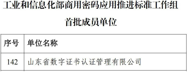 山東CA入選工信部商用密碼應用推進標準工作組首批成員單位