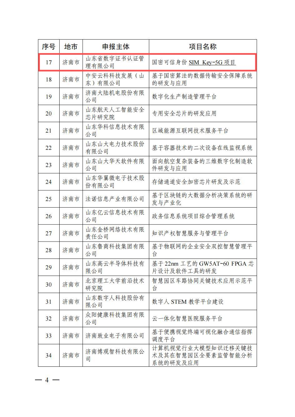 近日,山東省工業(yè)和信息化廳公布了第四批115個山東省軟件產(chǎn)業(yè)高質(zhì)量發(fā)展重點項目,山東CA公司申報的“國密可信身份SIM KEY-5G項目”成功入選。
