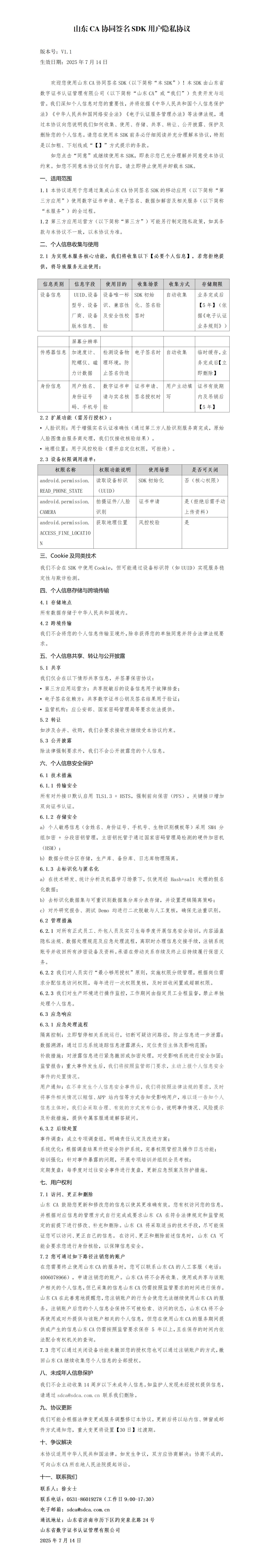 山東CA協(xié)同簽名SDK用戶隱私協(xié)議